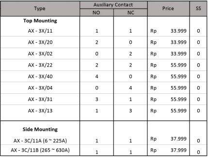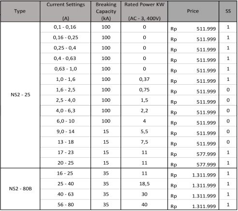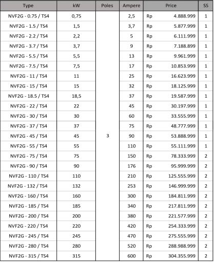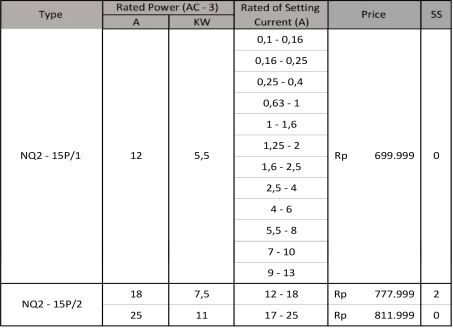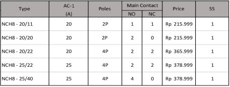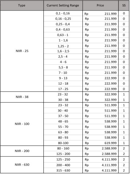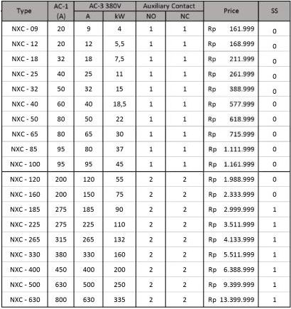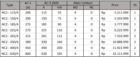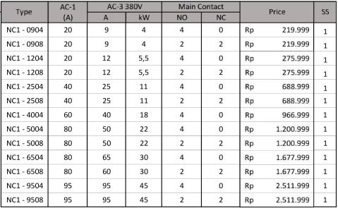 Motor Control and Protection AC Contactor NXC Series (3 Poles) NC2 Series (3 Poles) 4 Poles Contactor NC1 Series (4 Poles) NC2 Series (4 Poles) Mini Contactor NXC – 06M Series (3 Poles) NXC – 06M Series (4 Poles) JZC1 – Series Din Rail Contactor NCH8 – Series Contactor Accessories Auxiliary Block Contact. AX Series Time Delay Contact Block. F5 Series Thermal Overload Relay. NXR Series Motor Starter. NS2 Series Lateral Auxiliary Contact. Dol Starter. NS2 Series Inverter. NVF2G – Series Nb : Harga dapat berubah sewaktu-waktu, harap hubungi kontak kami untuk lebih lanjut. Kontak Kami WhatsApp0851-0072-3929, 0857-3444-9955,0812-3067-852, 0856-5588-9394Telpon0343-639-086, 0851-0181-1200 Email Kami Yahoo : omega.putra@yahoo.co.id Gmail : dept.marketing@omegaputra.com Lokasi Bengkel Kami Jl. Bonsai RT05 RW06, Baujeng, Kec. Beji, Pasuruan, Jawa Timur 67154, Indonesia